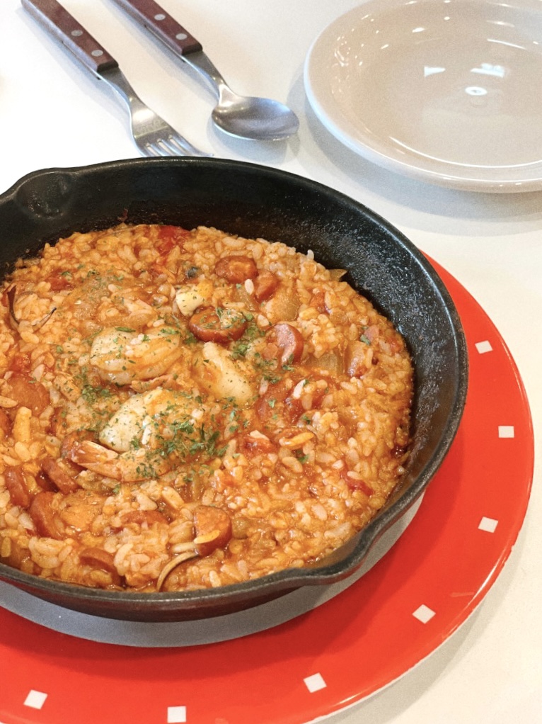 오징어, 새우, 조개 등 해산물에 소세지도 들어간 음식이며 약간 매콤했다. 소세지랑 해산물, 미국 향신료 맛이 섞여 느껴지는 새로운 맛이었다. 미국 향신료가 들어갔다지만 호불호가 있을 맛은 아니었다.