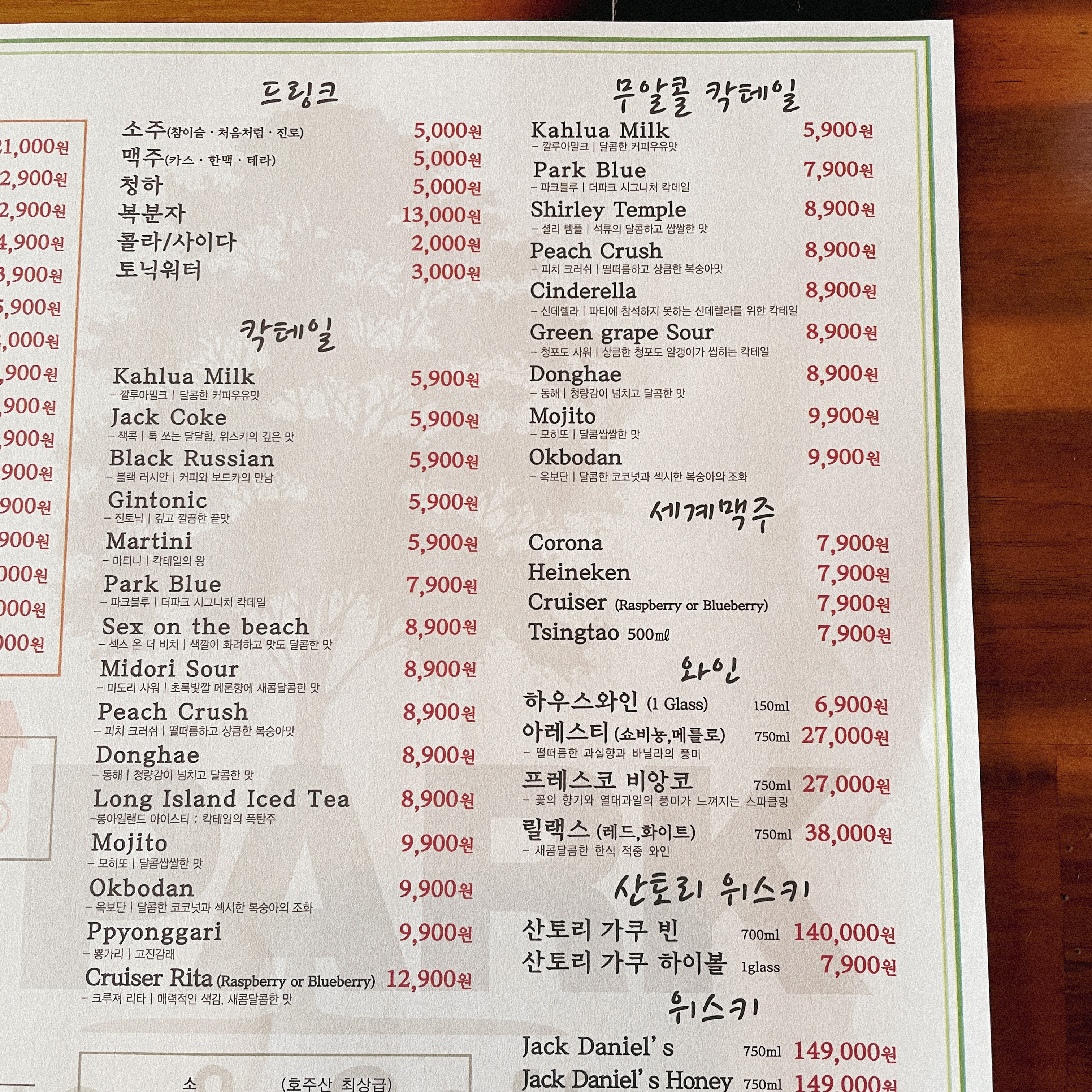 칵테일, 세계맥주, 와인 등 고깃집인데도 불구하고 술집만큼 다양한 주류 메뉴들이 있다. 우린 멀어서 차를 끌고온터라 술은 시키지 못해서 아쉬웠다.