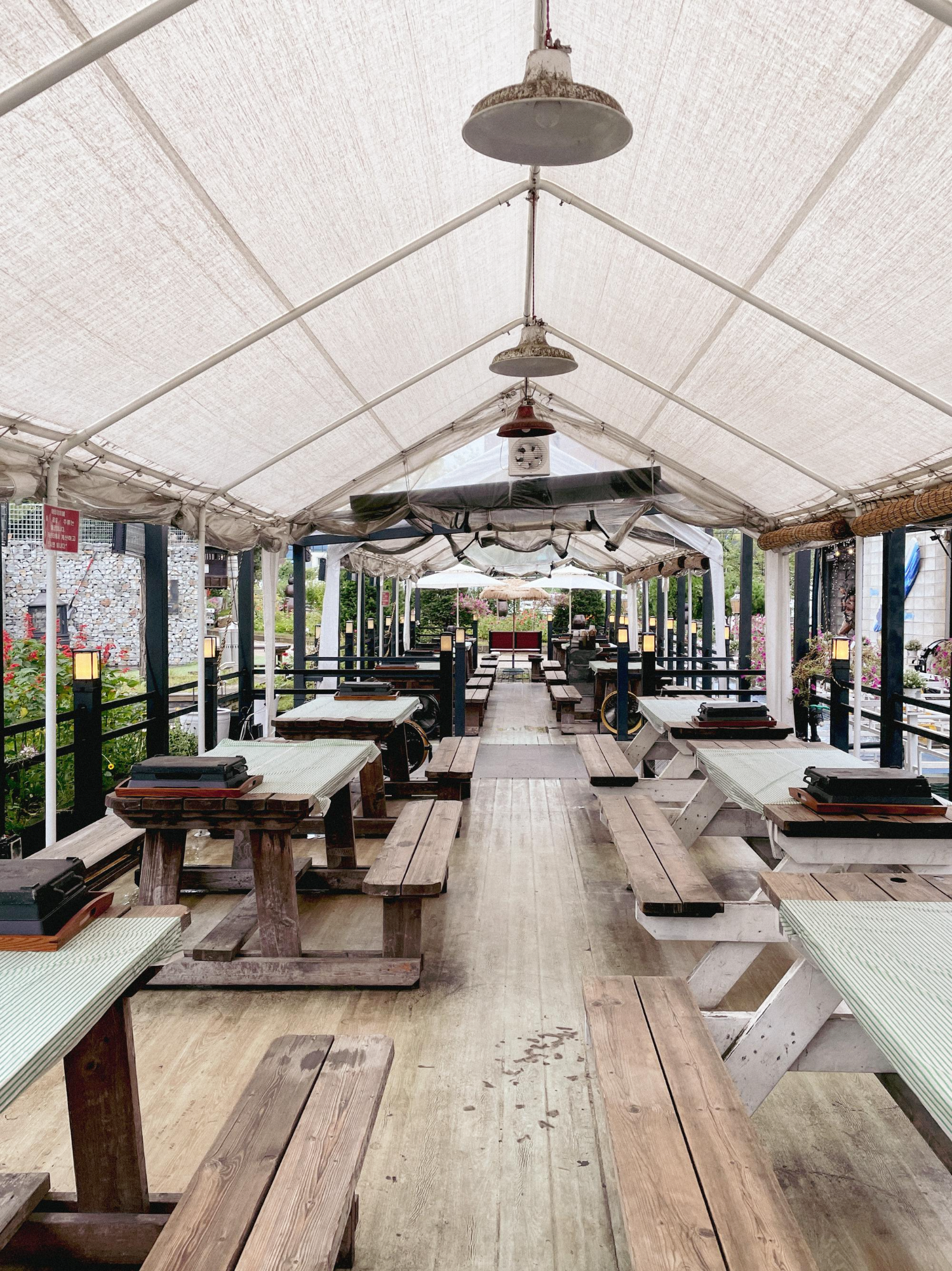 평일 1시쯤 방문햇는데도 창가쪽은 자리가 만석이라 그보다 한칸 뒷 자리로 앉았다. 참고로 이 날 비가 많이와서 밖에 앉으면 비를 맞게 된다하여 가게 안쪽에 앉았는데 여긴 날 좋을 때 바깥에 앉는게 더 좋은 가게이다. 비가 안올 때 가면 야외에 앉을 수 잇어 좋지만 나름 고기 먹으면서 빗소리가 들리니 운치 있었다.